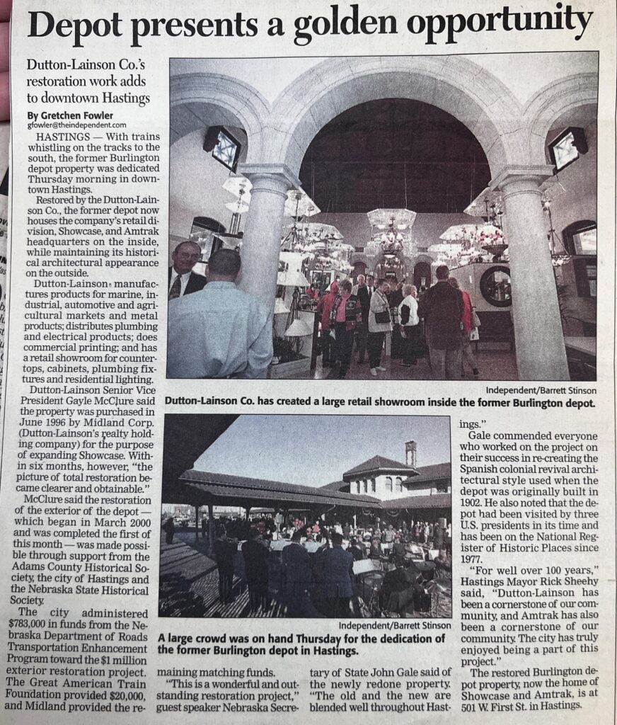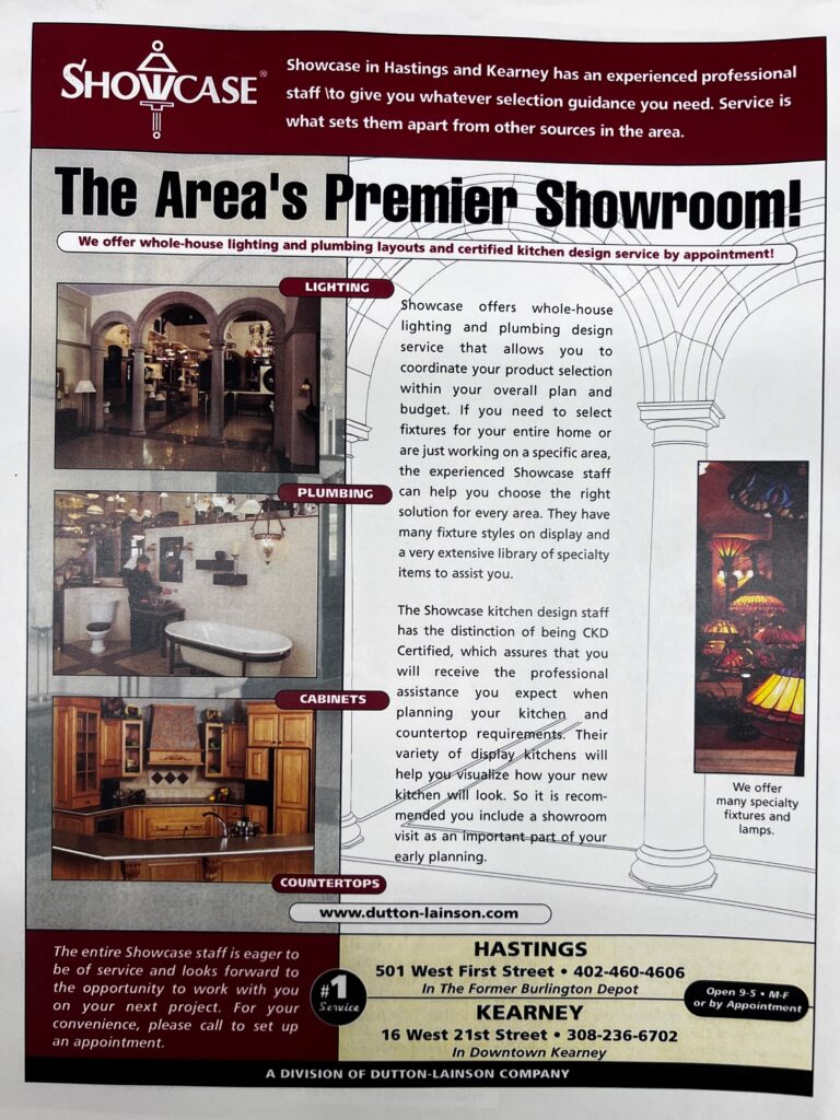 SHOWCASE® provided a large selection of lighting and plumbing fixture possibilities during the 1980’s and 1990’s, and the countertop manufacturing operation offered a wide variety of materials and designs.  When a custom cabinet line was added to the SHOWCASE® retail offerings in 1997, sales increased by 46% in one year.  The most exciting news for SHOWCASE®, however, was the company management’s decision to transform the old Burlington Northern Railroad Depot into a new venue for SHOWCASE® and new Amtrak offices. The U.S. Department of the Interior, the Nebraska Department of Roads, the Nebraska State Historical Society, the Adams County Historical Society, the City of Hastings, and two architectural firms worked with Dutton-Lainson Company to plan this transformation.
